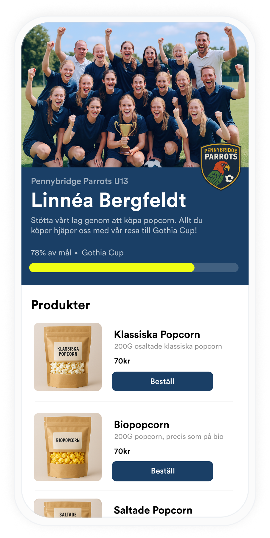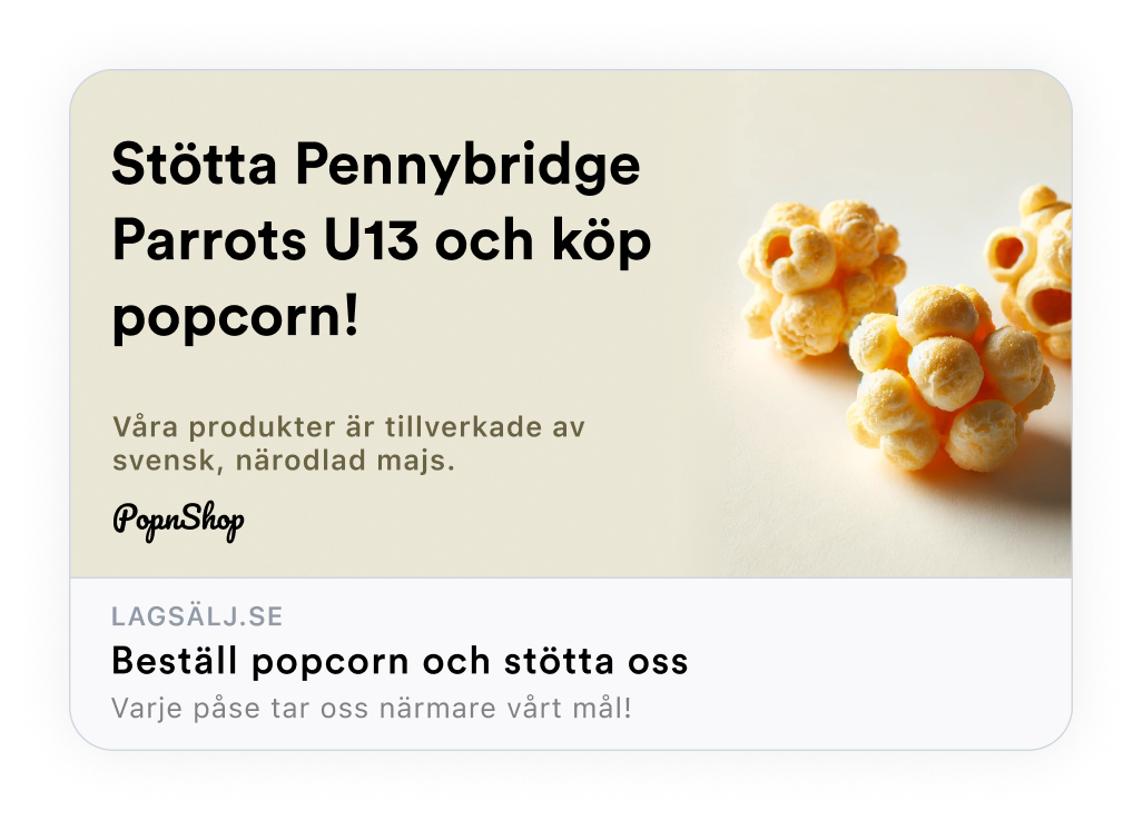 Ge lag, klasser och föreningar det bästa verktyget för att sälja era produkter. Delas enkelt via SMS och sociala medier, smarta säljmaterial som skapas automatiskt och registrering utan manuell handpåläggning.