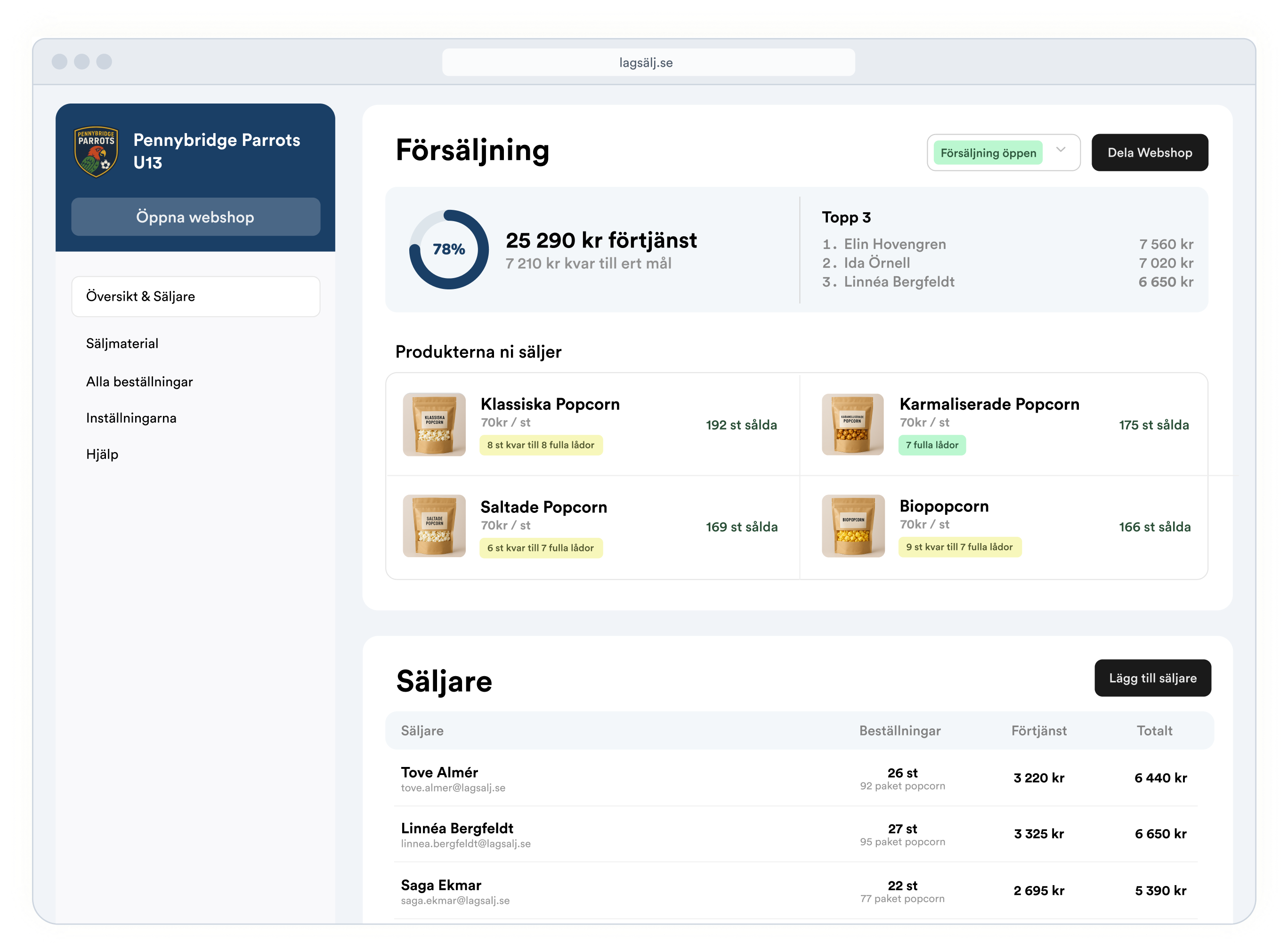 Kontaktpersonen har en tydlig översikt och kan enkelt bjuda in säljare, följa resultat och hantera gruppen. Varje säljare får en egen vy med personlig länk, säljmål och flyer för sociala medier.